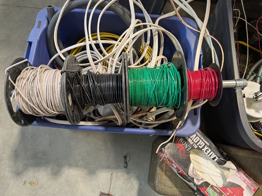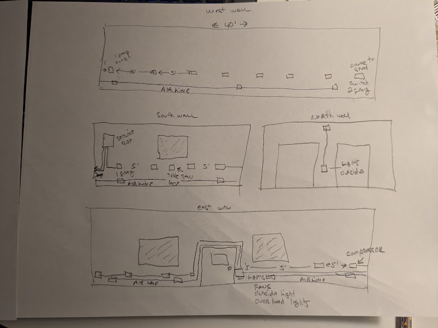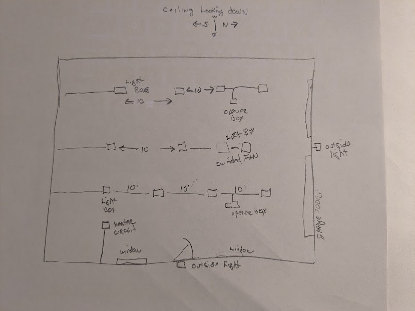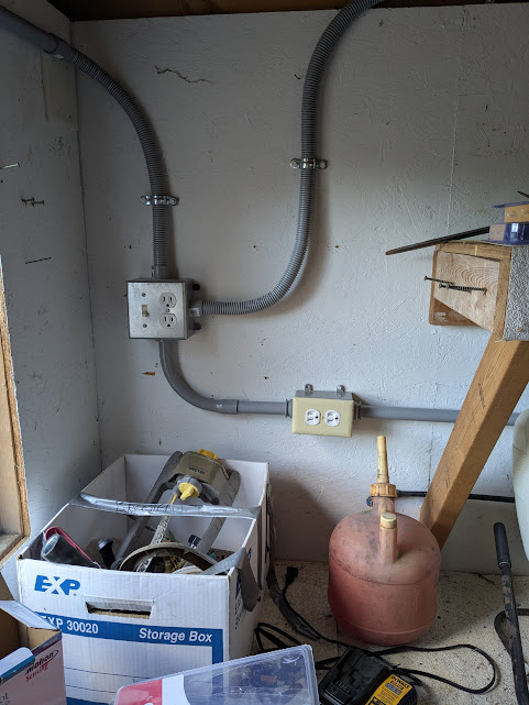 The guys were here about three hours-money well spent. Now it was my turn. I had sketched up some plans, trying to be efficient with the conduit and wire. Especially the wire. I knew prices had gone up over the last four years but copper wire has doubled in price. I wanted to avoid waste where I could.