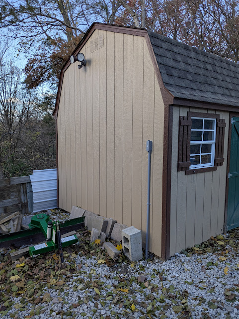 The shed had been wired previously and had numerous outlets in the finished and insulated walls but I had no idea if the wiring was corroded or had been gnawed on by varmints so I capped the outlets and ran my own. I only needed a couple of outlets for power, battery chargers and lights.