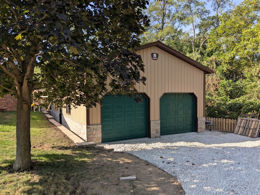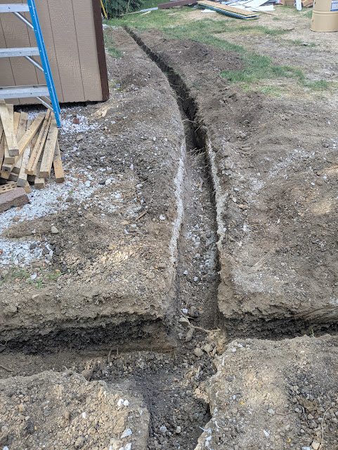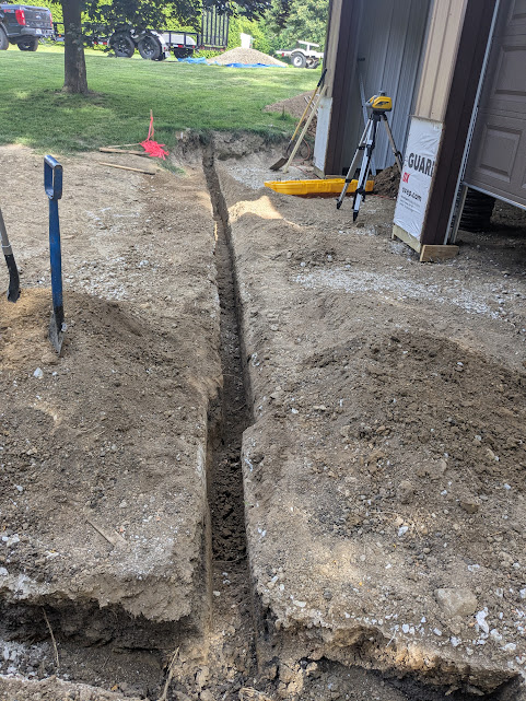 With the building was finished and before the concrete was poured, I trenched a tile across the front of the garage doors. I had watched this area during heavy rains and water drained from up the hill down between the workshop and the shed’s new location. I needed to make sure that the water would not flow right into the workshop.