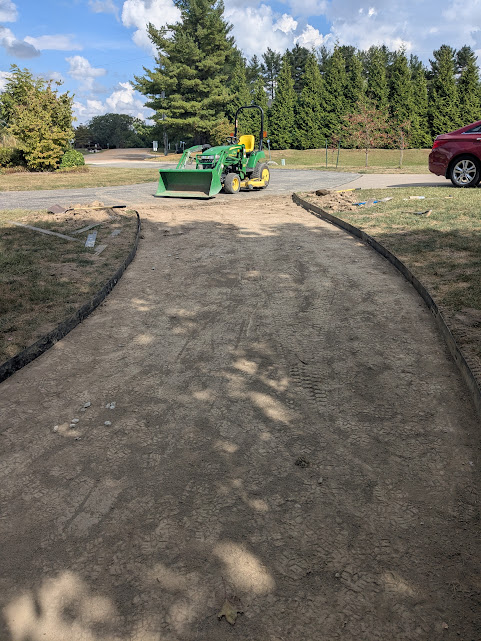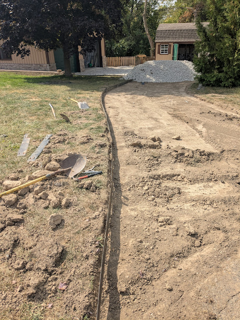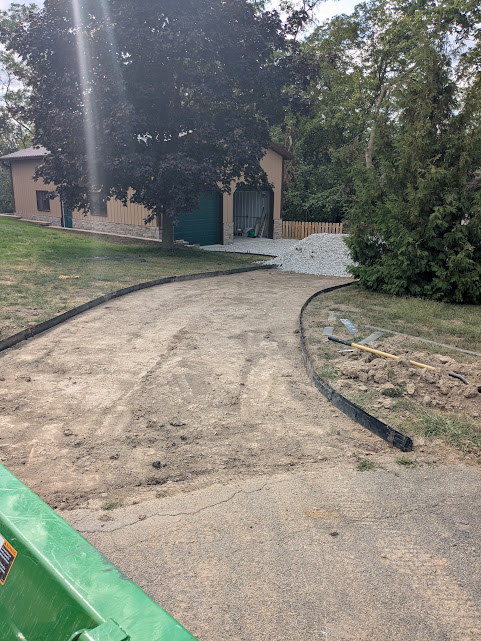 I rented a sod cutter and cut away the grass and 2-3″ of dirt. It was starting to take shape. I needed some type of border to hold the gravel in and withstand the abuse and weight of vehicle traffic that might not stray on the gravel. Plastic was out. Thick brick would have looked nice but would have taken some time to mortar in place. Plus the brick would have been very cumbersome to change if the size and shape of the drive didn’t quite work (spoiler alert: I will likely change and expand the drive in the spring of 2026).